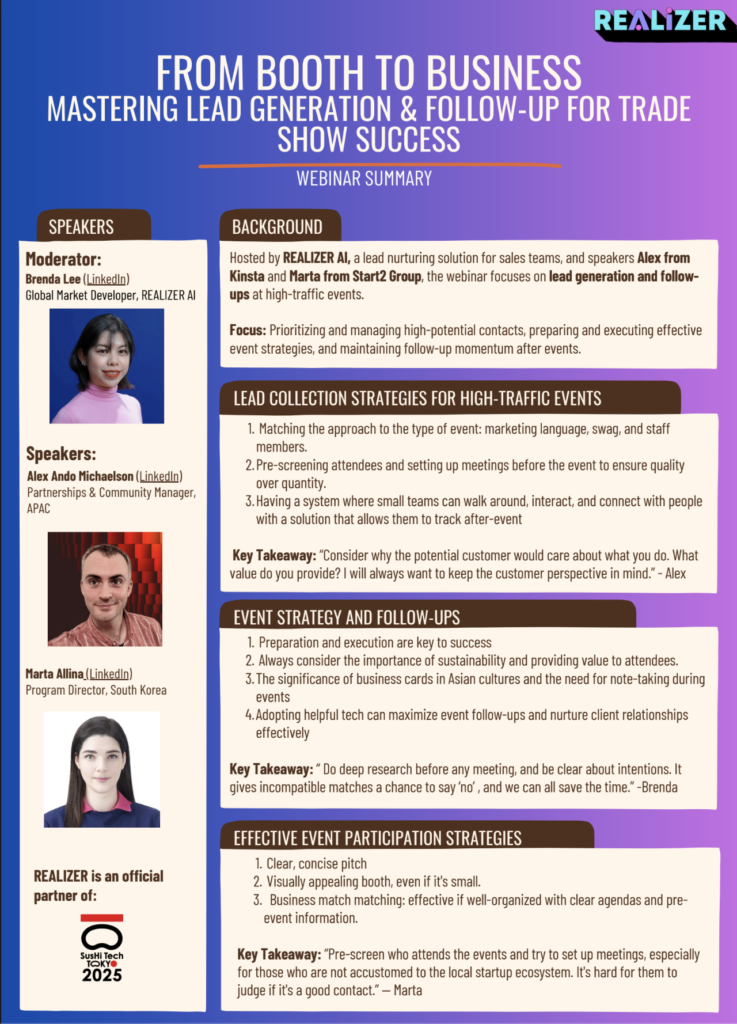 Hosted by REALIZER AI, a lead nurturing solution for sales teams, and speakers Alex from Kinsta and Marta from Start2 Group, the webinar focuses on lead generation and follow-ups at high-traffic events.
